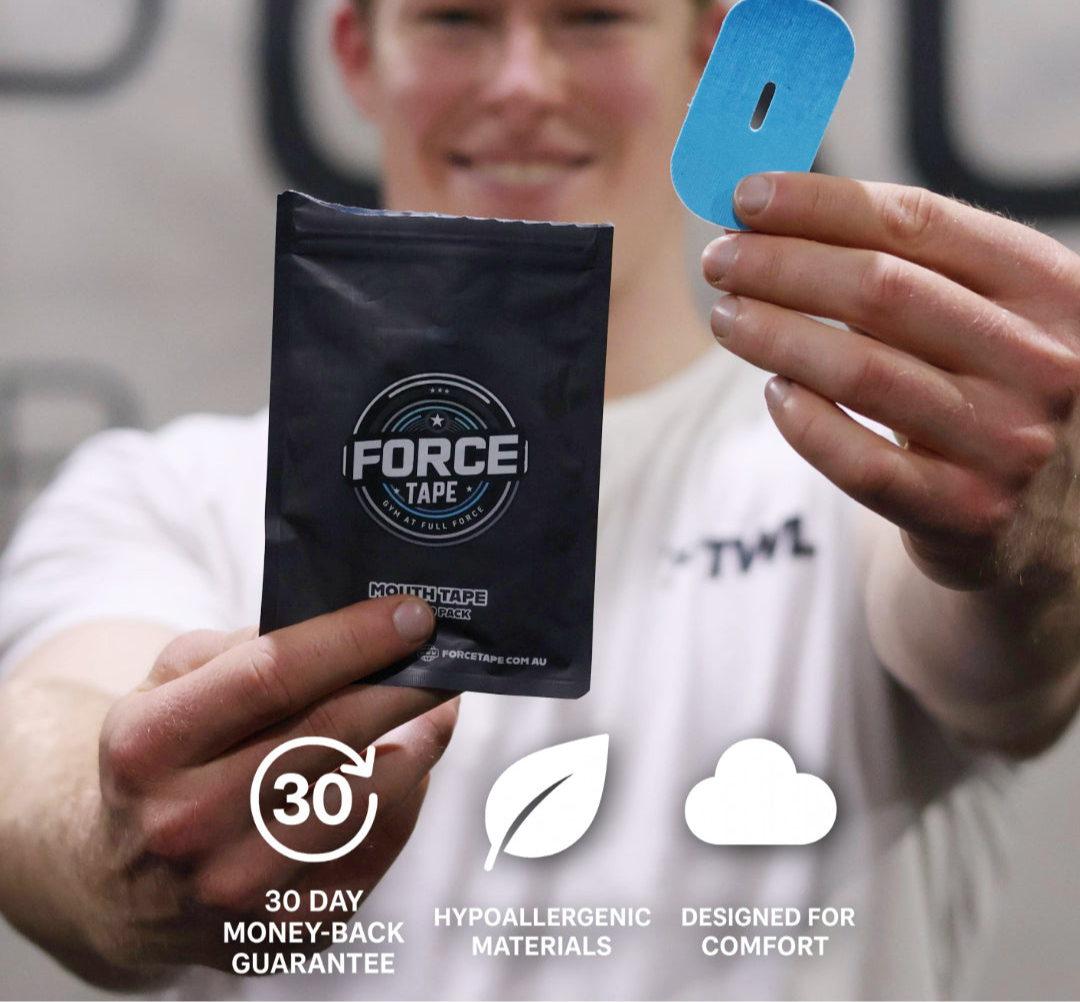Force Tape Mouth Tape seals your lips to reduce snoring and train nasal breathing — giving you deeper sleep, better airflow, and faster recovery.